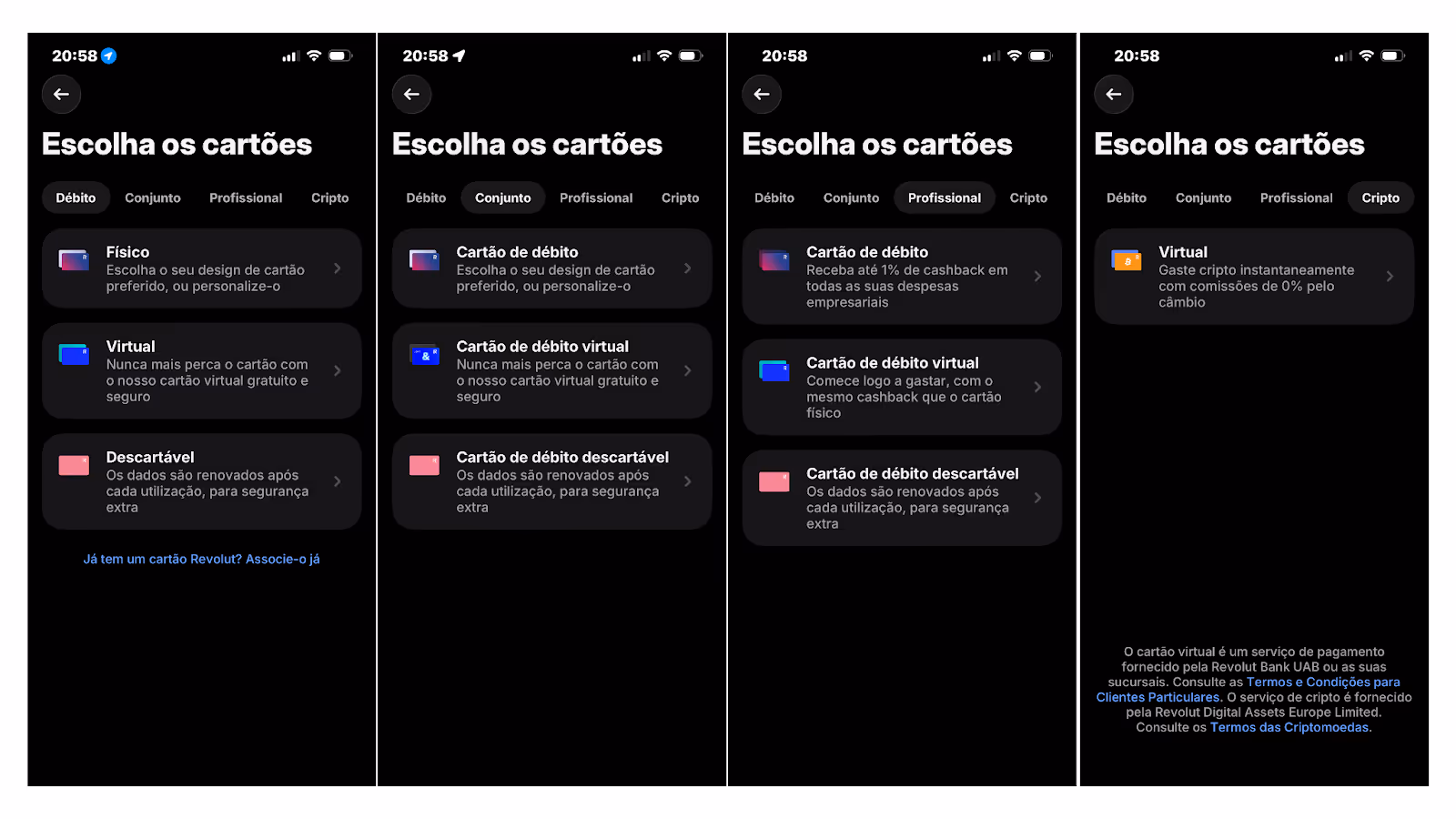 A Revolut disponibiliza cartões de débito individuais, para contas conjuntas, para contas profissionais e ainda cartões para virtuais para pagamentos com cripto: