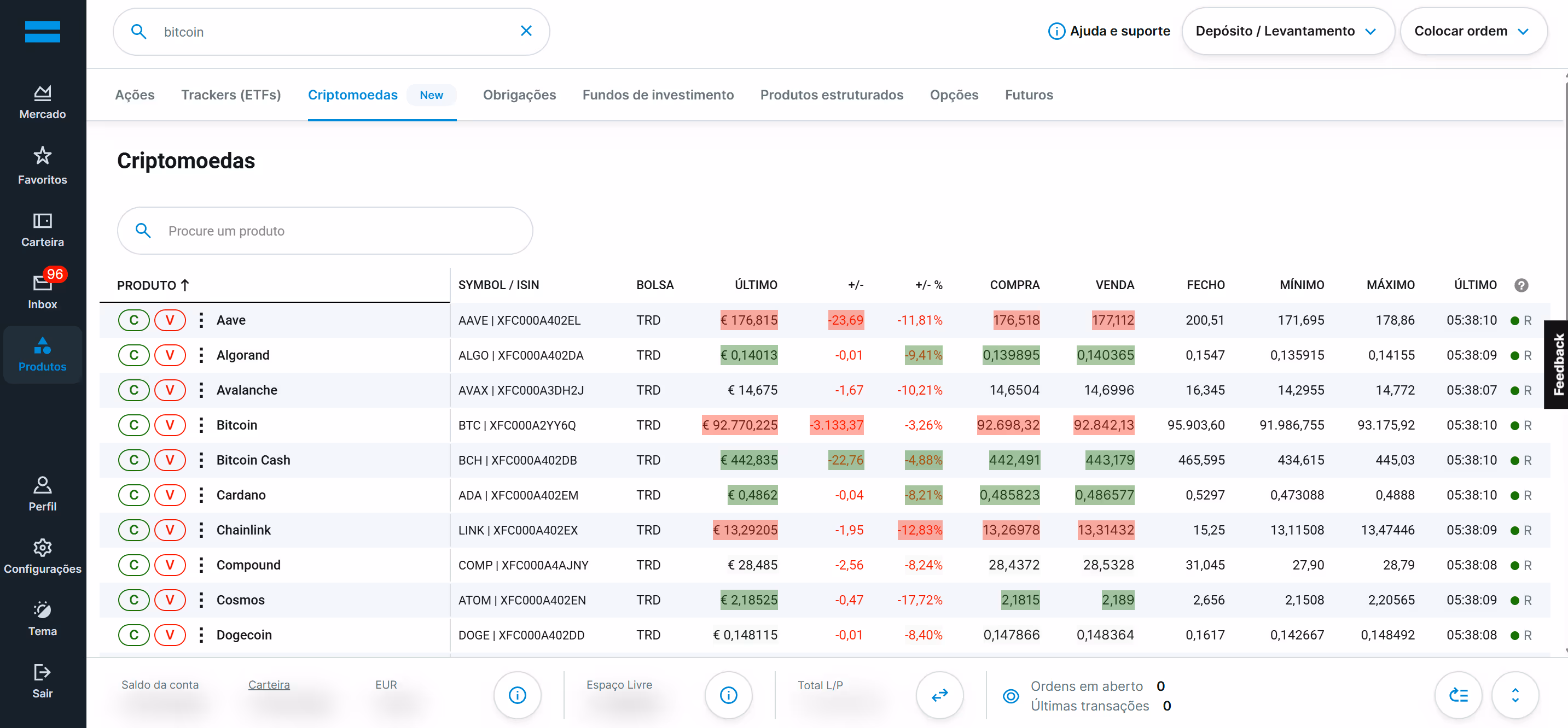 No canto superior esquerdo (na barra de pesquisa), podes procurar por qualquer ativo. À medida que escreves, os resultados vão sendo filtrados automaticamente até aparecer o que procuras. Por isso, se tens um produto específico em mente, basta usares a barra de pesquisa.