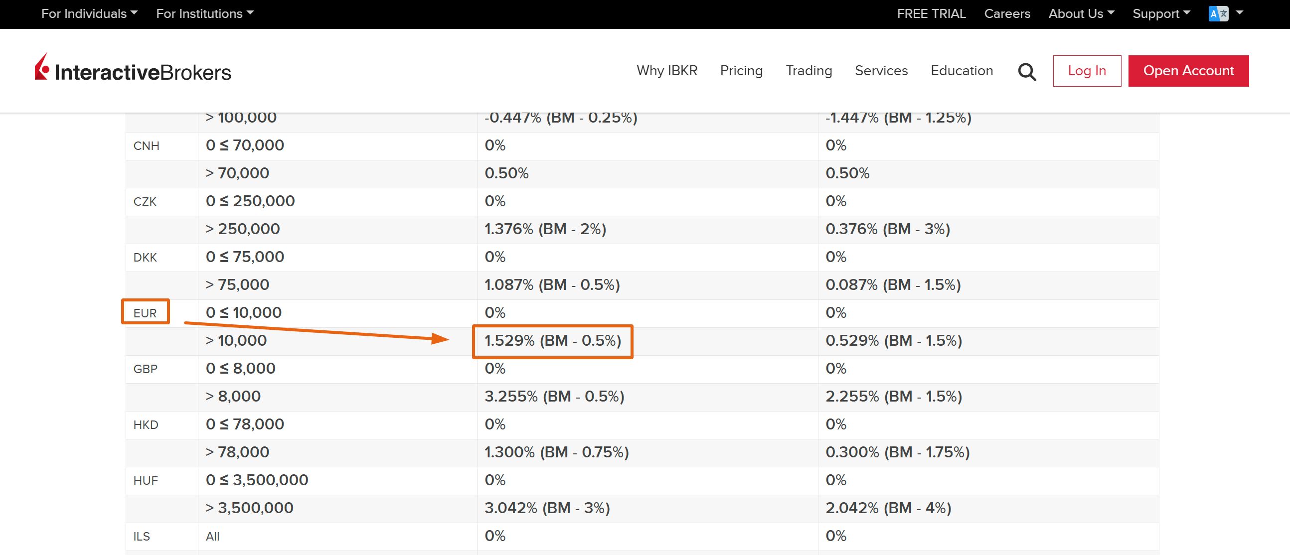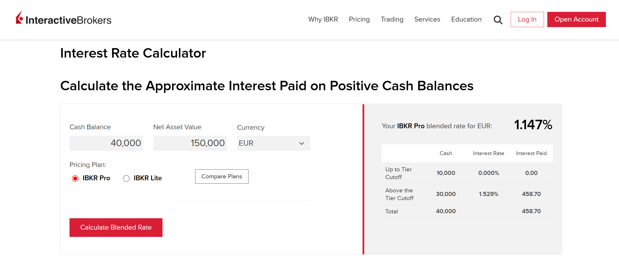 A Interactive Brokers é das plataformas de investimentos que remunera o capital não investido dos clientes, mas com um grande asterisco: apenas remunera dinheiro acima de 10.000€, ou seja, se tiveres 15.000€ parados, só recebes juros sobre 5.000€. À data deste artigo, os juros pagos em euros eram de 1.529%: