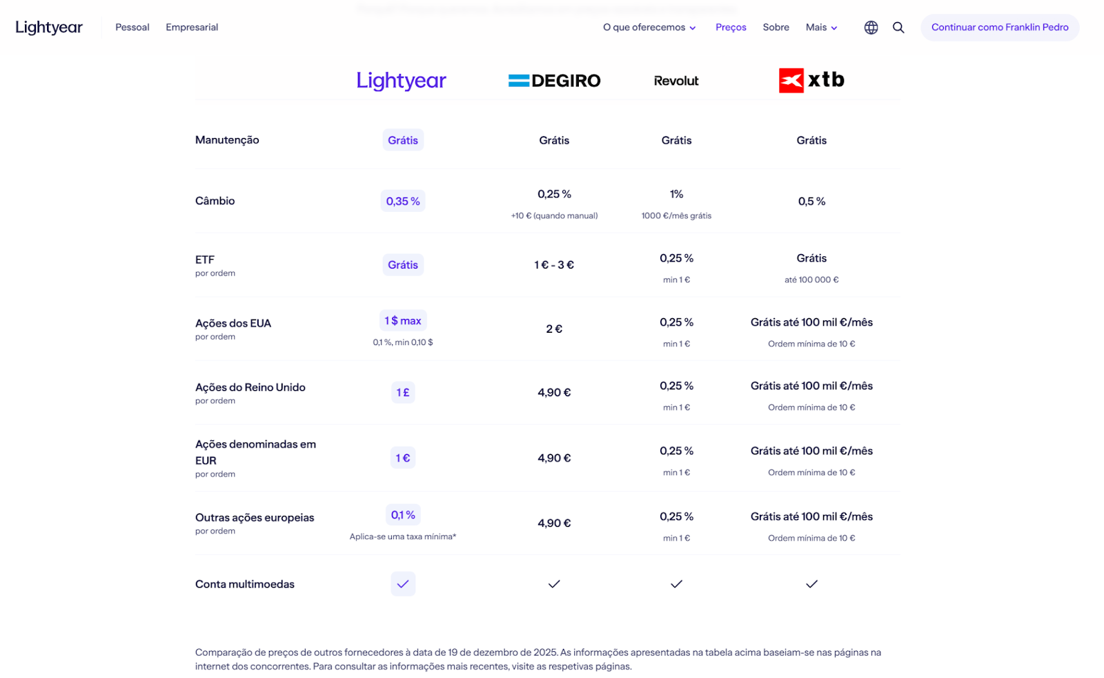 A Lightyear apresenta a seguinte tabela a comparar-se com a concorrência relativamente aos custos: