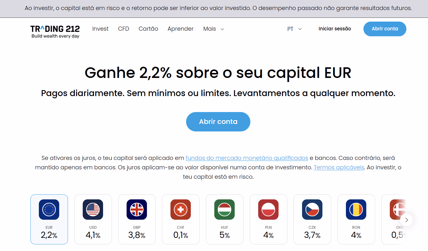 A Trading 212 é das plataformas de investimentos mais generosa no que toca à remuneração do teu capital parado na conta: 2.20% em euros, à data de publicação deste artigo.