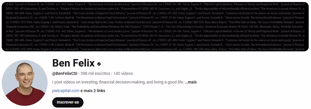 Um defensor do investimento passivo e de longo prazo. Ben Felix publica vídeos com uma enorme pesquisa, falando sobre investimentos bem como muitos outros tópicos financeiros.