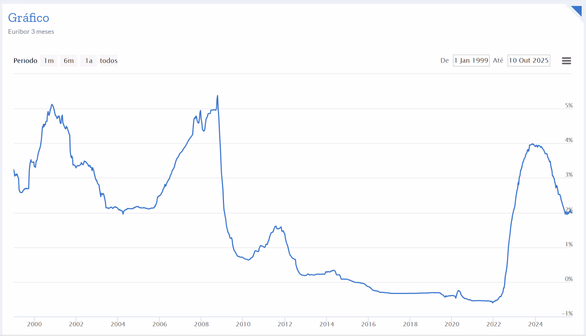 Recebes uma taxa-base: indexada à EURIBOR a 3 meses. Esta taxa nunca pode ser inferior a 0% nem superior a 2,5%. Podes ver aqui a evolução da EURIBOR desde 1999: