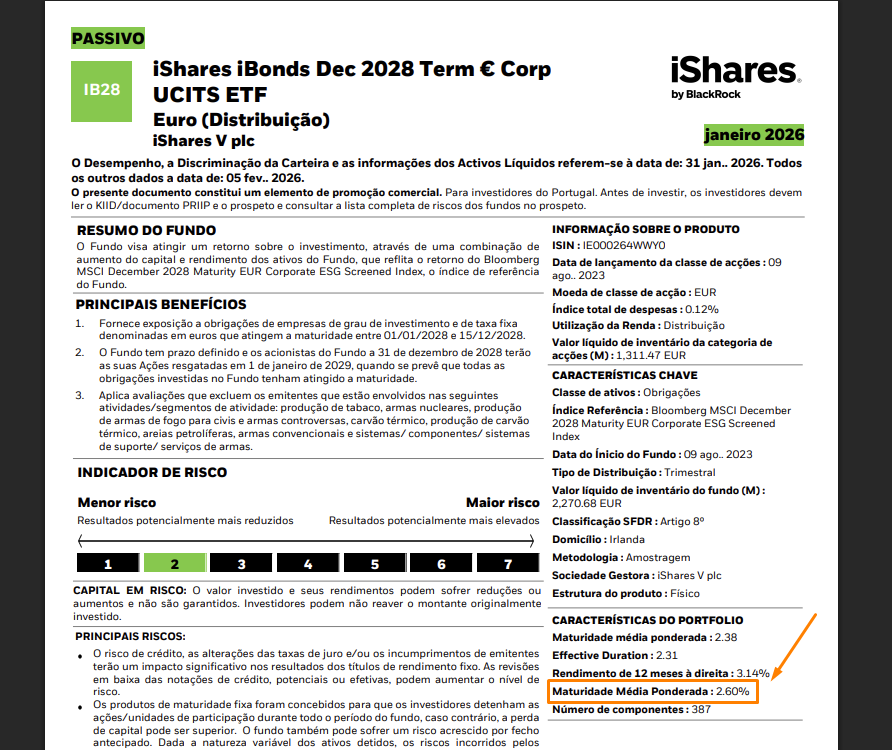 Vamos a um exemplo: o iShares iBonds Dec 2028 (ficha informativa) apresentava uma rentabilidade até à maturidade ("Yield to Maturity", em inglês) de 2,60%, à data de janeiro de 2026. Isto quer dizer que, se comprares o iBond e o mantiveres até à data de vencimento, terás uma expectativa de rentabilidade média anual próxima de 2,60%, já considerando: