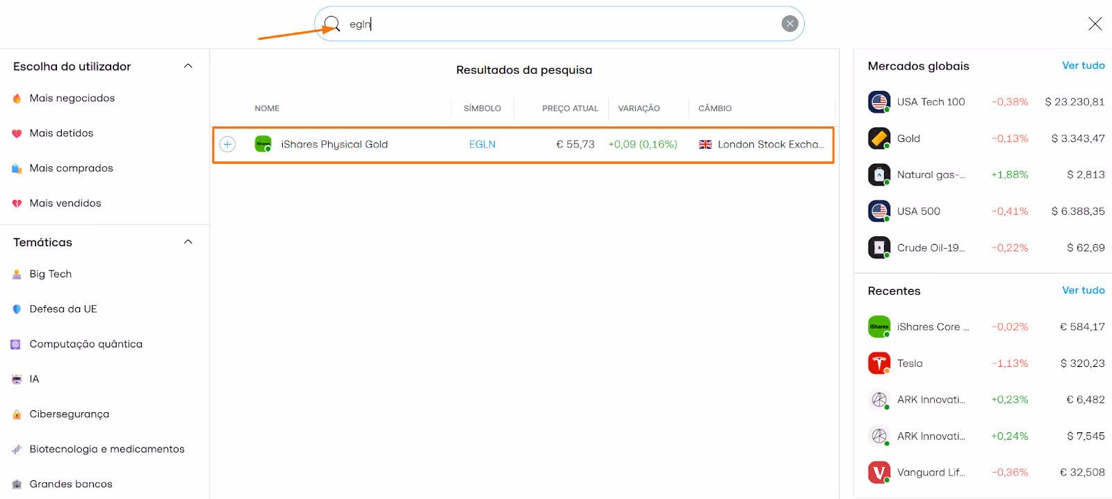 1º passo: Pesquisas pelo ETF desejado na barra de pesquisa. Vamos usar o EGLN (um dos tickers do iShares Physical Gold ETC):