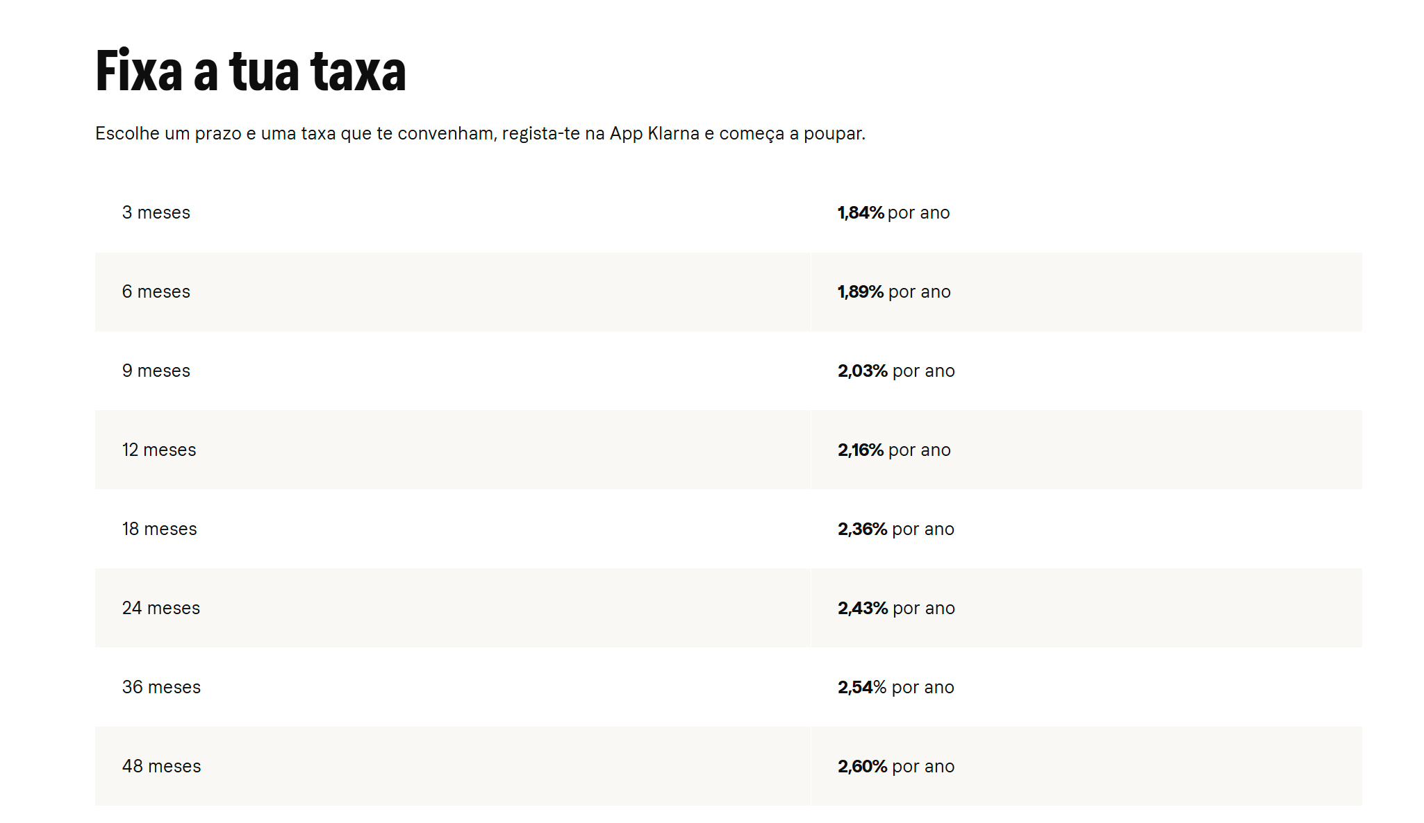 A Klarna também oferece contas de poupança a prazo fixo com taxas de juro competitivas (até 2,60%/ano - à data de novembro de 2025), permitindo ao utilizador aplicar o seu dinheiro com maior rendimento e segurança. Também aqui, estás protegido pelo sistema de garantia de depósitos sueco.
