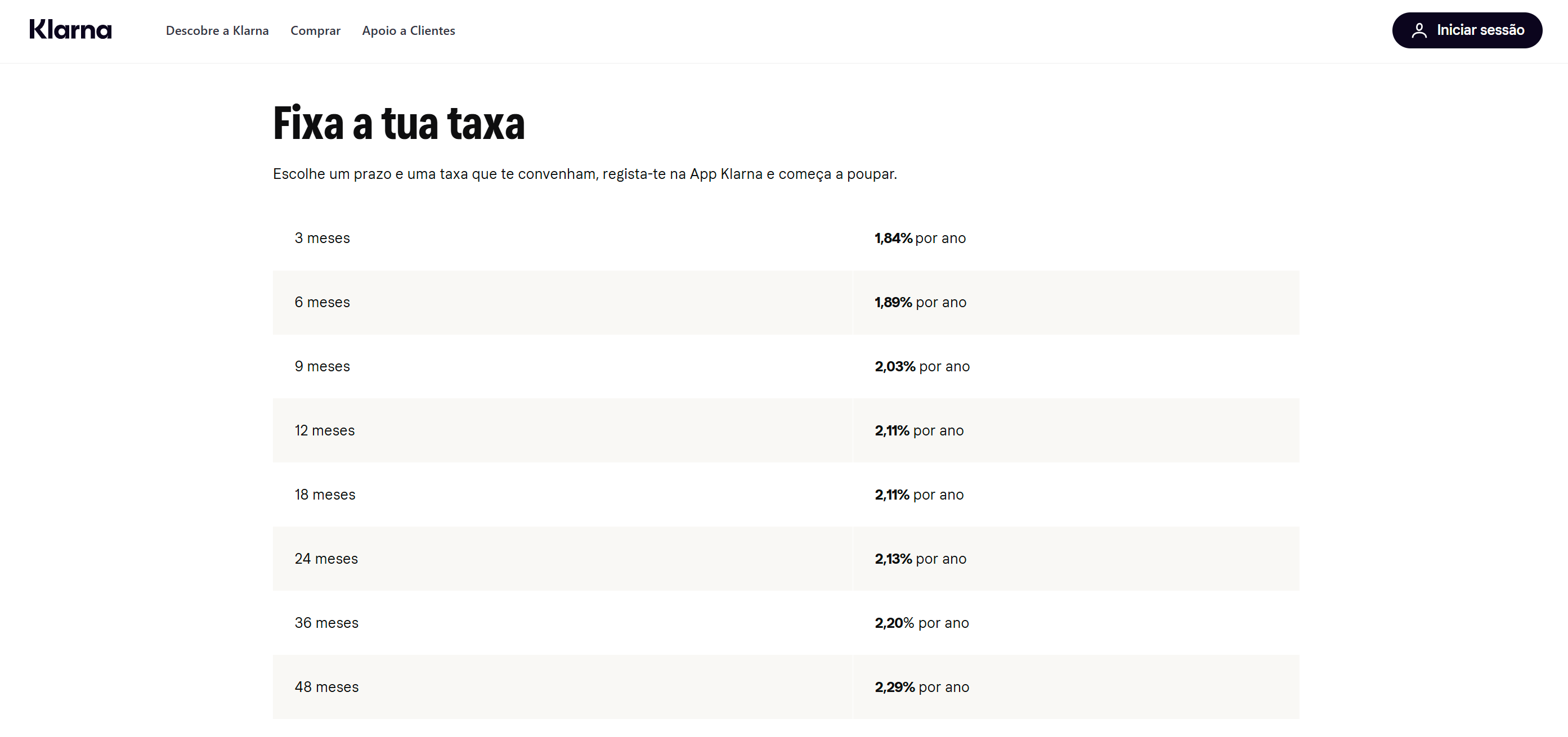 A Klarna também oferece contas de poupança a prazo fixo com taxas de juro competitivas (até 2,29%/ano - à data de novembro de 2025), permitindo ao utilizador aplicar o seu dinheiro com maior rendimento e segurança. Também aqui, estás protegido pelo sistema de garantia de depósitos sueco.