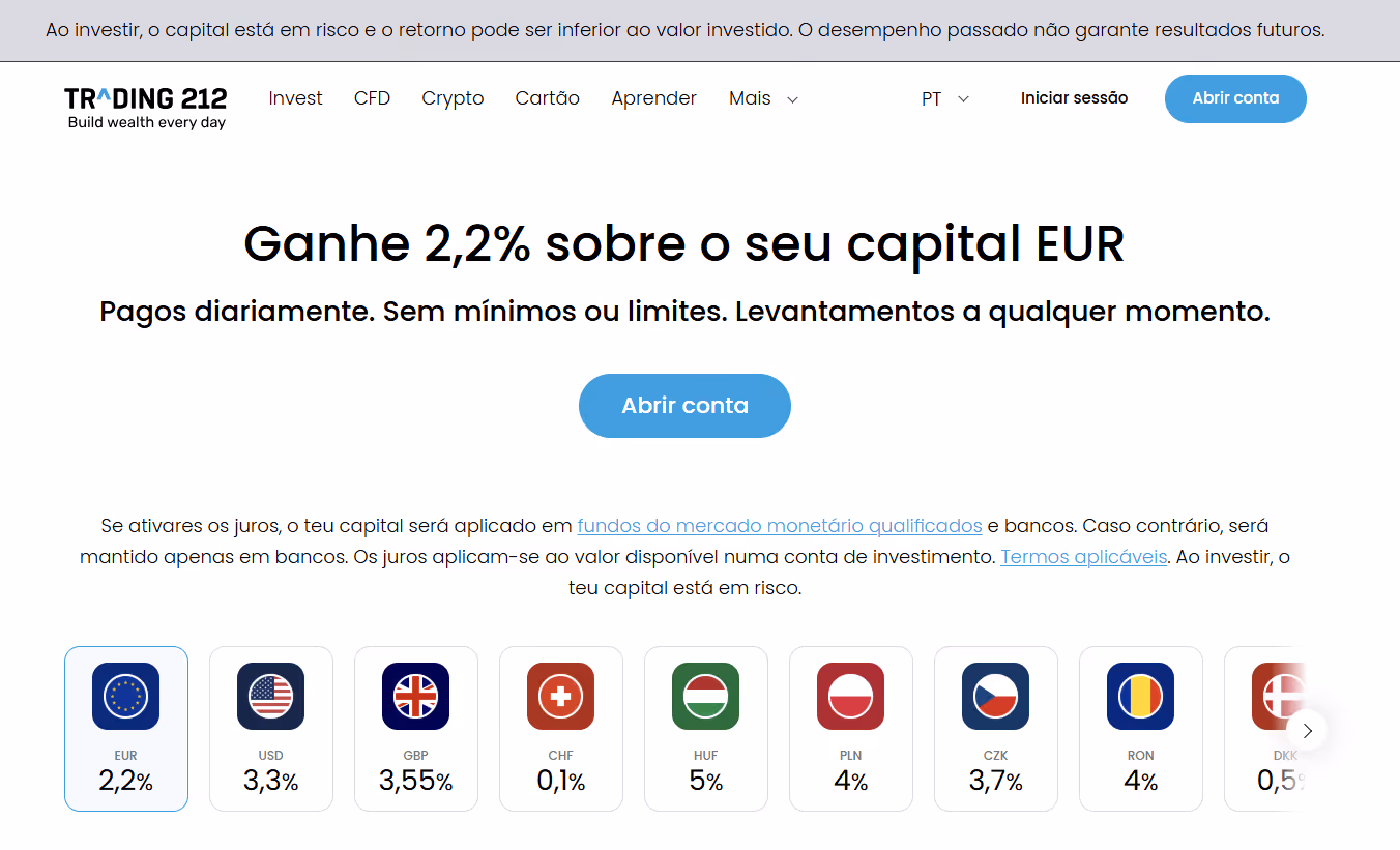 A Trading 212 remunera o teu dinheiro não investido em 2,20%. Contudo, depois de abrires conta, tens de ativar essa opção indo a "Definições" e selecionar "Juros sobre capital". Depois é só seguir os passos.