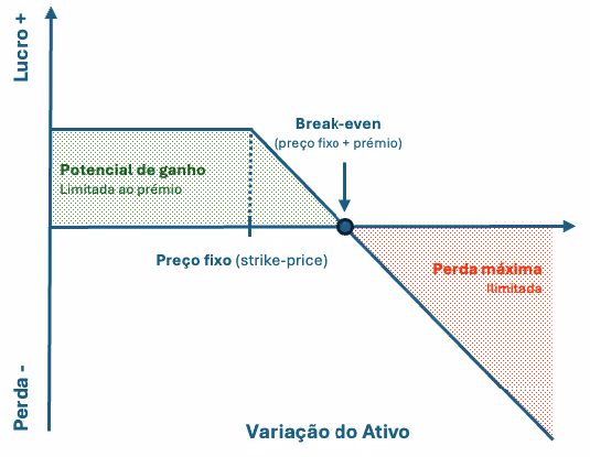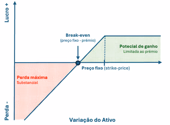 - Potencial de ganho: elevado, mas limitado até o preço do ativo chegar a zero.