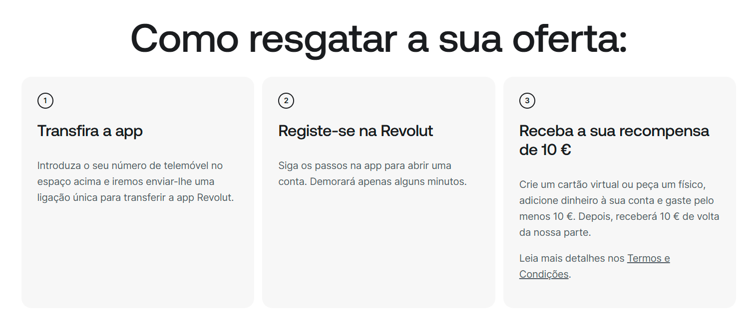 - Gasta 10€ no primeiro mês: Cria um cartão virtual ou pede um cartão físico, adiciona saldo e efetua um pagamento de pelo menos 10€. Assim que fizeres essa transação, a Revolut credita os 10€ de bónus dentro de 3 dias úteis.