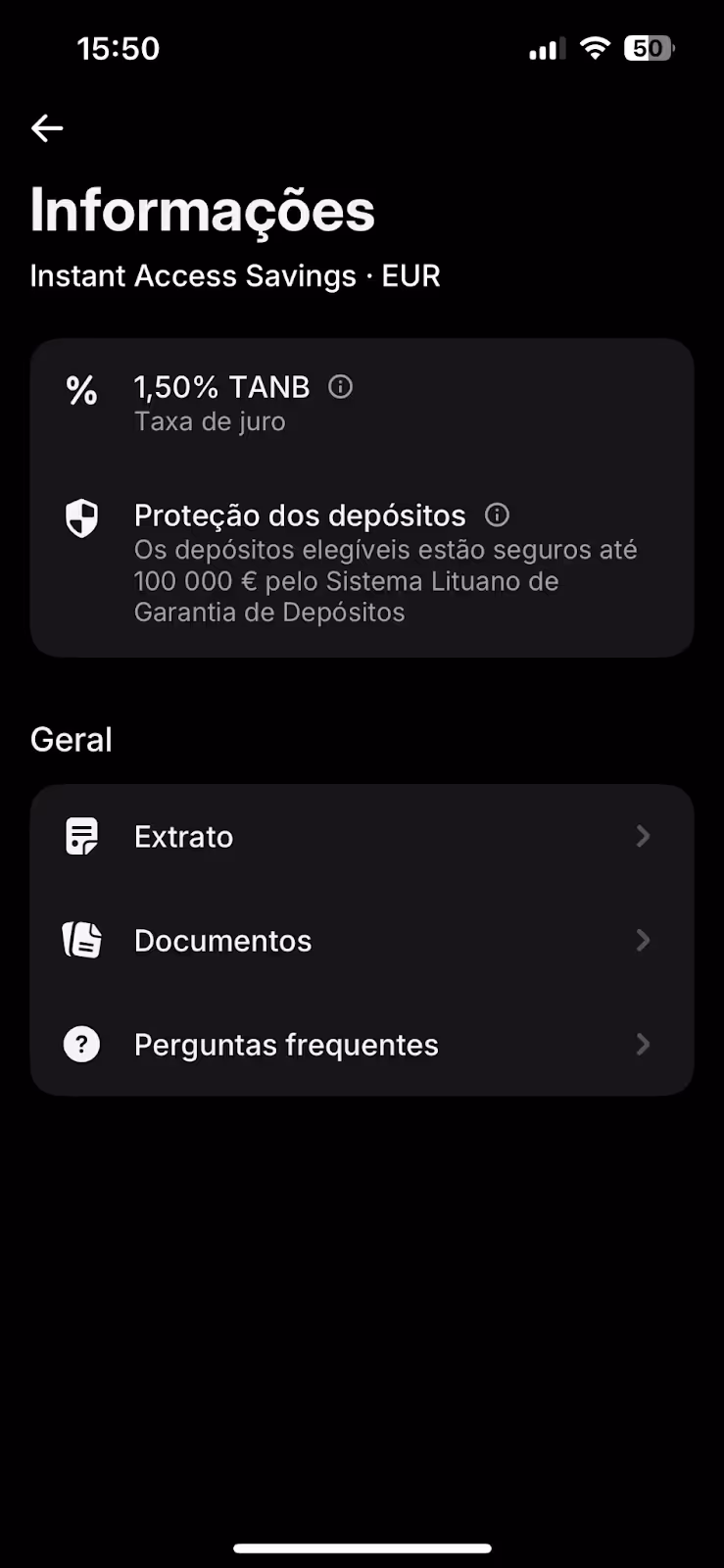 É bastante simples de configurar, e é elegível para o sistema lituano de proteção de depósitos. A conta à ordem está sujeita a comissão de manutenção de conta pacote, entre 0€ / mes na conta Standard até 50€ / mes na conta Ultra. Montante máximo de depósito de 100.000€. Fizemos a subscrição da conta poupança na conta Standard: