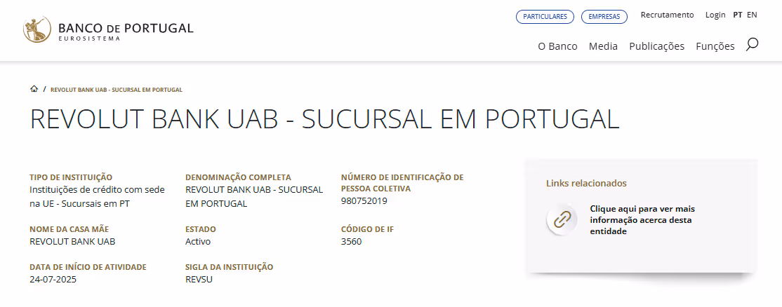 A Revolut já disponibiliza IBAN português (PT) por meio da Revolut Bank UAB – Sucursal em Portugal, devidamente registada no Banco de Portugal.