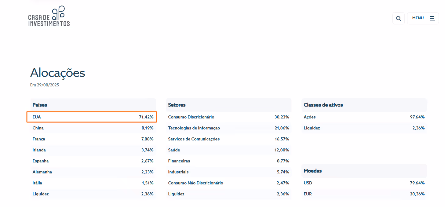 Por fim, tem uma exposição ao dólar de praticamente 80%, o que é normal por, mais uma vez, ter grande exposição a empresas americanas que estão cotadas em dólares e outras cotadas nessa mesma moeda, como é o caso da Alibaba.
