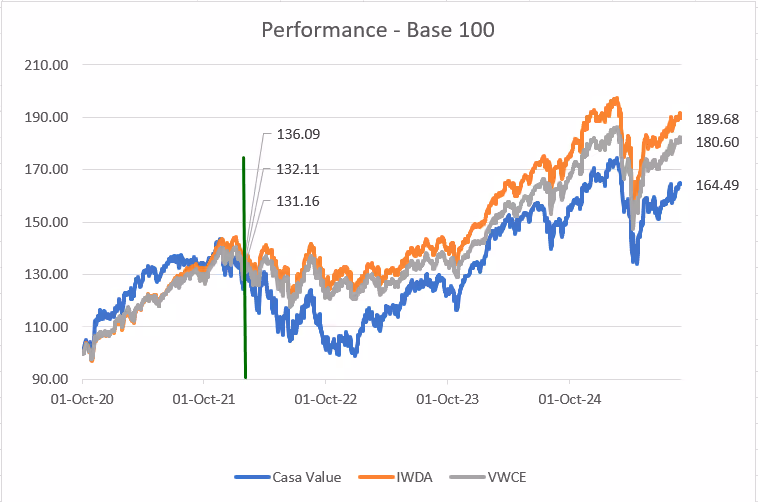 Aqui, analisamos a rentabilidade desde outubro de 2020 até 31 de agosto de 2025 da classe founders e comparamos com dois ETFs de ações: o IWDA, que investe em 23 países do mundo desenvolvido, e o VWCE, que, para além de países desenvolvidos, também investe em países de mercados emergentes.