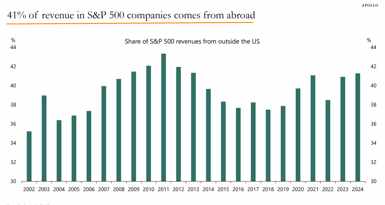 Contudo, não quer isto dizer que temos uma exposição real de 70% aos EUA, como está indicado, porque o mais importante são as receitas das empresas e não onde estas estão sediadas. Em 2024, 41% das receitas das empresas presentes no S&P 500 eram oriundas de outros países:
