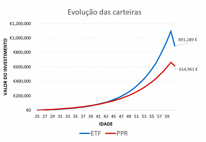 Como vês, o diferencial seria ainda maior: ~1.3 milhões para o ETF, mas perto de 650.000 euros para o PPR.