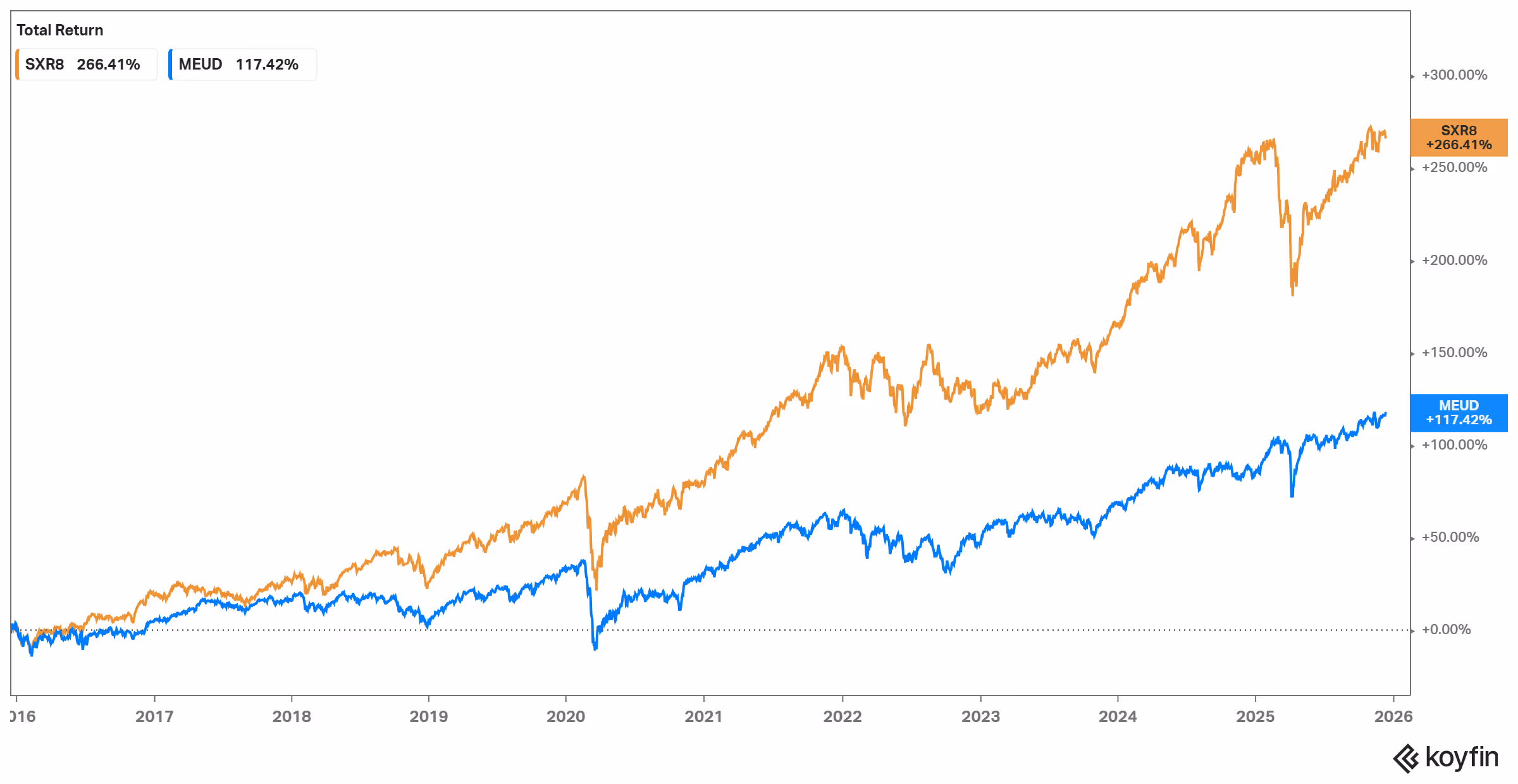 Historicamente, porém, o S&P 500 superou o STOXX 600 quase sempre: desde 1992, obteve em média 10,95% ao ano contra 7,91%, com risco semelhante (desvio-padrão). Nos últimos dez anos, 100€ investidos em janeiro 2015 ter-se-iam tornado €365 no S&P 500 e €217 no STOXX 600 (dados Koyfin até 12 de dezembro de 2025, através de ETFs que replicam cada um dos índices):